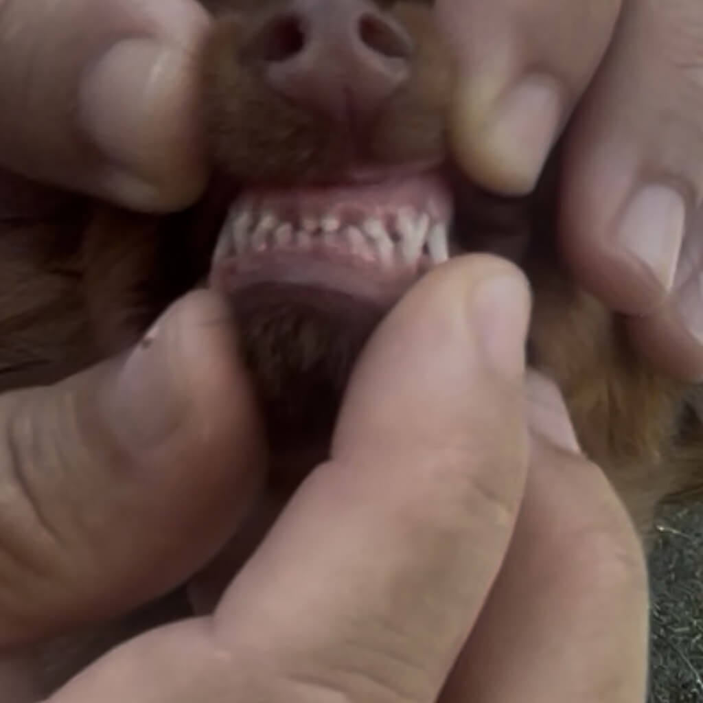 - Correct bite, no hernia, no open fontanel, testicles on place.
